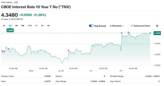 미 국채 10년물 금리 차트, 자료=야후 파이낸스, 2025.07.04 koinwon@newspim.com |