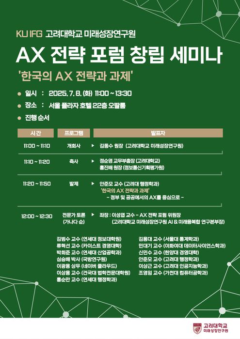 고려대학교 미래성장연구원(원장 김동수)은 오는 8일 서울 플라자 호텔에서 'AX 전략 포럼' 창립세미나를 개최한다고 밝혔다.