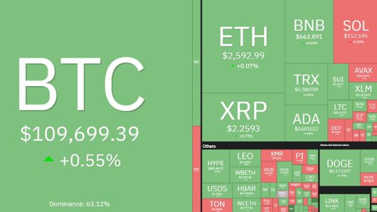 [디지털투데이 AI리포터] 비트코인(BTC)이 소폭 상승하며 투자심리 회복에 대한 기대를 키웠다. 암호화폐 데이터 플랫폼 코인360(COIN360)에 따르면, 4일 오전 8시 기준 비트코인은 24시간 전보다 +0.55% 오른 10만9699.39달러에 거래됐다. 비트코인은 간밤 11만달러를 살짝 넘기는 등 호조를 보였다. 시장 점유율은 63.12%를 유지하며 여전히 압도적인 우위를 보였다.