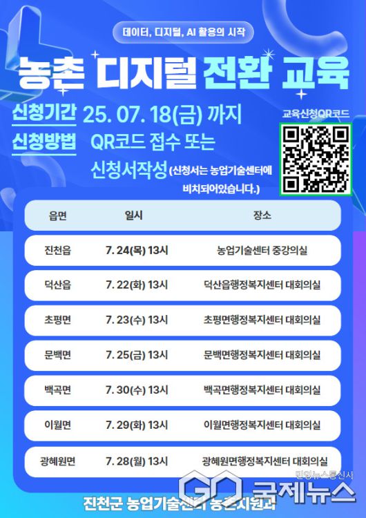 (진천=국제뉴스) 이재기 기자 = 충북 진천군농업기술센터는 오는 22일부터 30일까지 관내 7개 읍면을 순회하며 '농촌 디지털 전환 교육: 데이터·디지털·AI 활용의 시작' 교육을 본격 운영한다고 4일 밝혔다.