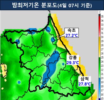 4일 강원지방기상청에 따르면 전날 오후 6시부터 이날 오전 7시 사이 최저기온은 강릉 29.3도, 삼척 27.8도, 속초·양양 27.2도, 고성 26.8도, 동해 25.5도 등을 기록했다.
