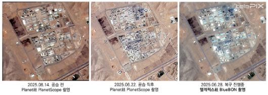 공개된 위성영상은 공습 전후, 복구가 진행 중인 모습 등 총 3장이다. 6월 14일 미국 플래닛 사의 플래닛스콥(Planetscope) 영상, 공습 직후인 6월 22일 같은 시스템으로 촬영된 영상, 복구가 일부 진행된 6월 28일 텔레픽스의 AI 위성, 블루본으로 촬영한 영상이다.