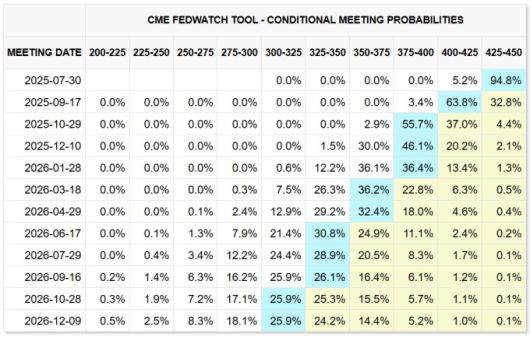 트레이더들도 이러한 평가에 동의하고 있다. 한국시간 기준 4일 오전 CME 페드워치에 따르면 7월 28~29일 열리는 연준 회의에서 금리 인하 가능성은 25%에서 5% 수준으로 떨어졌다.