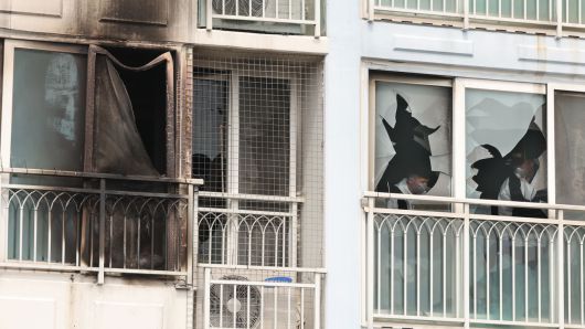 ▲ 어린이 2명이 숨진 부산 기장군의 한 아파트 6층 화재 현장에서 3일 오전 경찰, 소방, 국립과학수사연구원 등이 합동 감식을 벌이고 있다.