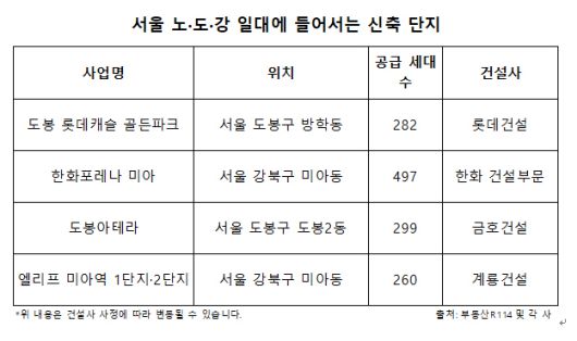 롯데건설은 서울 도봉구 방학동 일원에서 '도봉 롯데캐슬 골든파크'의 입주를 시작한다. 한화 건설부문은 올해 11월 서울 강북구 미아동 일원에서 '한화포레나 미아'의 입주를 앞두고 있다. 내년 3월 도봉구 도봉2동 일원에서는 금호건설의 '도봉아테라(구, 도봉금호어울림리버파크)'가 입주할 예정이다.