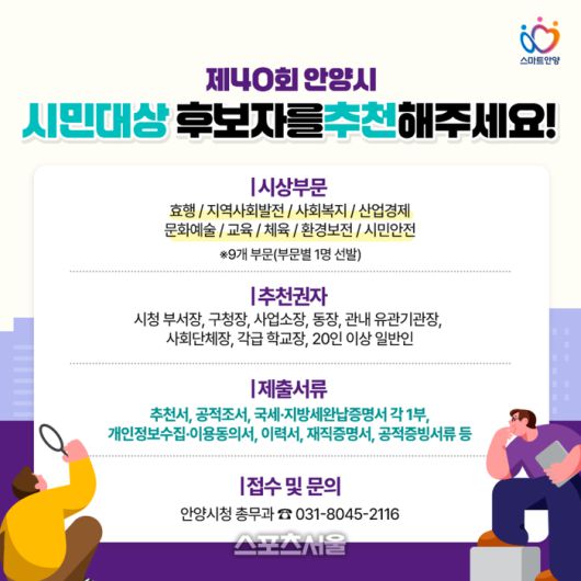 〔스포츠서울│안양=좌승훈기자〕경기 안양시는 오는 31일까지 ‘시민대상’ 후보자를 추천받는다고 4일 밝혔다.