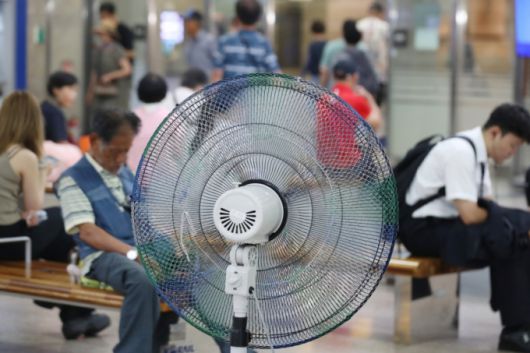 일주일째 폭염특보가 이어진 3일 대구 북구 대구역 대합실에서 시민들이 대형 선풍기 앞에 앉아 열차를 기다리고 있다. /사진=뉴스1 |
