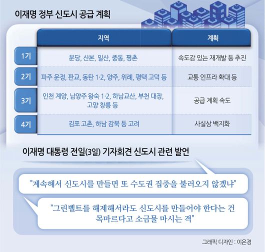 이 대통령이 신도시 공급에 대해 부정적 견해를 밝힌 것은 서울을 중심으로 한 수도권 신도시 지정이 ‘지역 균형 발전’을 헤칠 수 있다는 우려에서다. 다만 3기 신도시 진척이 더딘 만큼, ‘공급 속도전’을 위해선 추가적 규제 완화가 제시될 가능성이 나온다. 1~2기 신도시 재개발·재건축 완화는 물론 3기 신도시에도 용적률 상향 조정 등이 거론된다.