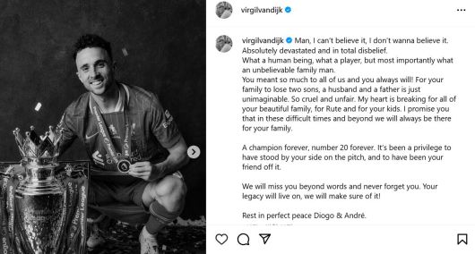 리버풀의 주장 버질 판데이크는 "믿을 수 없다. 믿고 싶지 않다"며 심경을 털어놨다. 그는 "정말 훌륭한 선수였지만, 무엇보다도 가족을 소중히 여긴 놀라운 사람이었다. 두 아들과 딸, 그리고 아내 루트를 생각하면 마음이 찢어진다. 우리는 끝까지 그들의 곁에 있을 것이다. 조타는 영원한 챔피언이고, 영원한 20번이다"라고 전했다.