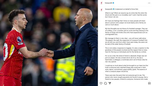 아르네 슬롯 리버풀 감독은 리버풀 구단을 통해 발표한 공식 성명에서, 조타를 향한 깊은 애정과 상실감을 표현했다.