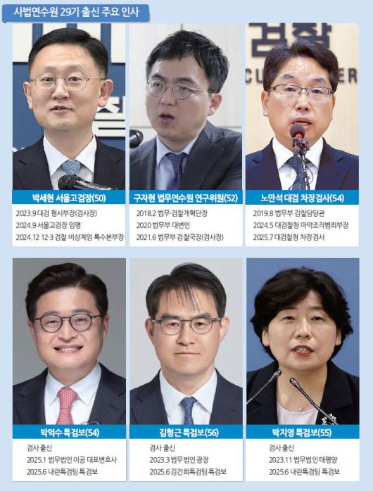 특히 사법연수원 29기는 검찰 내부에서 ‘에이스’로 평가받는다. 2021~2023년 단일 기수 내 최다 검사장을 배출한 것으로 알려졌다. 사법연수원 29기는 사법연수원 수료생 숫자가 크게 늘던 격변기의 기수다. 사법연수원 26기까지는 수료생 숫자가 200명 후반대에 머물렀지만 27기 들어 300명을 돌파했고, 이어 28기 486명, 29기 590명으로 크게 늘었다. 수료생 숫자가 증가하면서 좋은 인재들이 검찰로 다수 유입됐다. 사법연수원 29기는 지난 1일 단행된 이재명 정부 첫 검찰 인사에서도 요직에 발탁됐다. 정진우(53) 서울중앙지검장, 검찰의 2인자로 불리는 노만석(55) 대검찰청 차장검사도 사법연수원 29기다.