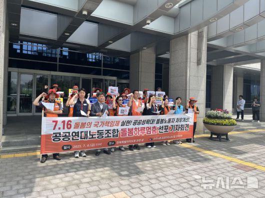 [전주=뉴시스] 강경호 기자 = 전국민주노동조합총연맹(민주노총) 공공연대노조 전북본부 조합원들이 4일 오전 전북 전주시 전북특별자치도청 앞에서 '공공연대노조 돌봄 하루멈춤 선포 기자회견'을 열고 구호를 제창하고 있다. 2025.07.04. lukekang@newsis.com |