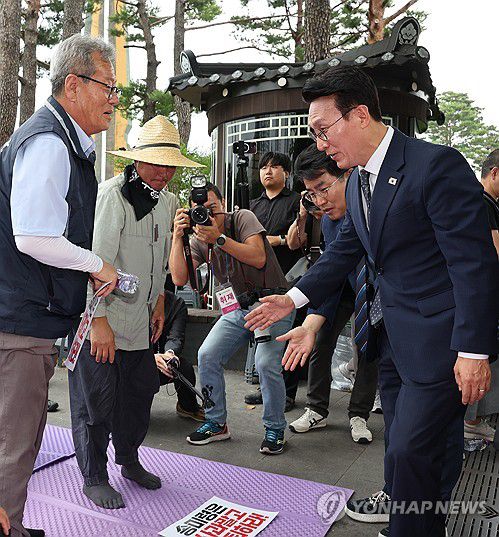(서울=연합뉴스) 이진욱 기자 = 4일 김민석 국무총리가 서울 용산 대통령실 앞에서 항의 집회 중인 농민단체와 악수하고 있다. 이들 단체는 '농업4법'을 '농망4법'이라고 했던 송미령 농림축산식품부 장관의 유임을 반대하며 송 장관이 물러날 때까지 투쟁을 멈추지 않겠다고 예고한 상태다. 2025.7.4