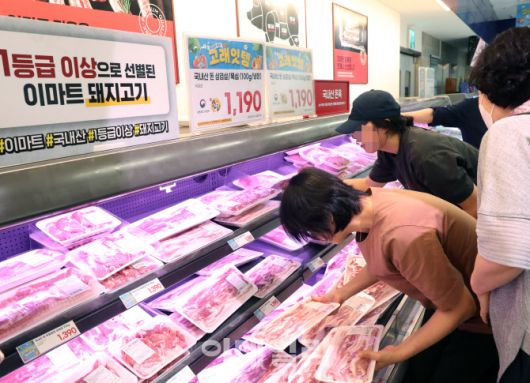 [이데일리 김태형 기자] 4일 서울 용산구 이마트용산점에서 소비자들이 삼겹살을 구입하고 있다. 이마트는 4일부터 6일까지 '고래잇 페스타 쿨 썸머 세일'을 통해 파격 할인을 실시한다.