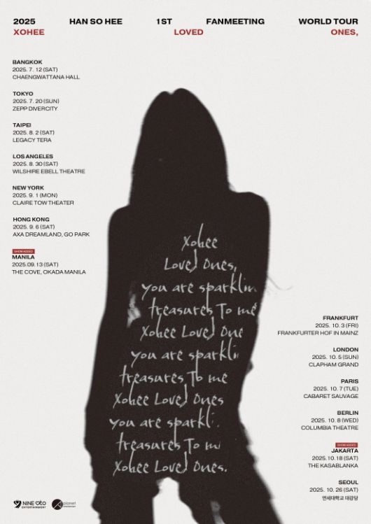 소속사 9아토엔터테인먼트에 따르면, 한소희는 9월 13일 마닐라, 10월 18일 자카르타에서 ‘2025 HAN SO HEE 1st FANMEETING WORLD TOUR [Xohee Loved Ones,](2025 한소희 퍼스트 팬미팅 월드투어 [소희 러브드 원즈,])’를 추가 개최하고 현지 팬들을 만난다.