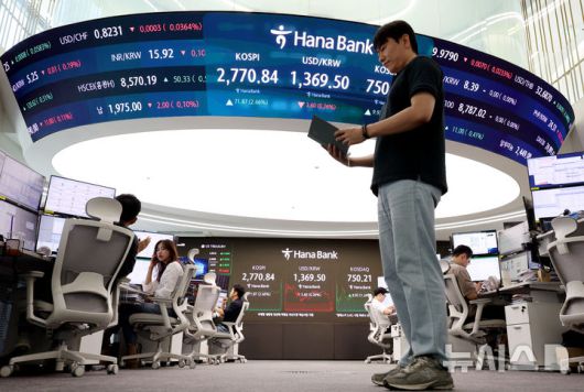 [서울=뉴시스] 김진아 기자 = 이재명 대통령의 증시 부양 기대감에 증권주가 일제히 강세를 보이고 있는 4일 서울 중구 하나은행 딜링룸에서 딜러들이 업무를 보고 있다. 코스피는 전 거래일(2698.97)보다 71.87포인트(2.66%) 급등한 2770.84에, 코스닥 지수는 전 거래일(740.29)보다 9.92포인트(1.34%) 오른 750.21에 거래를 종료했다. 서울 외환시장에서 원·달러 환율은 전 거래일(1373.1원)보다 3.6원 내린 1369.5원에 주간 거래를 마감했다. 2025.06.04. bluesoda@newsis.com |