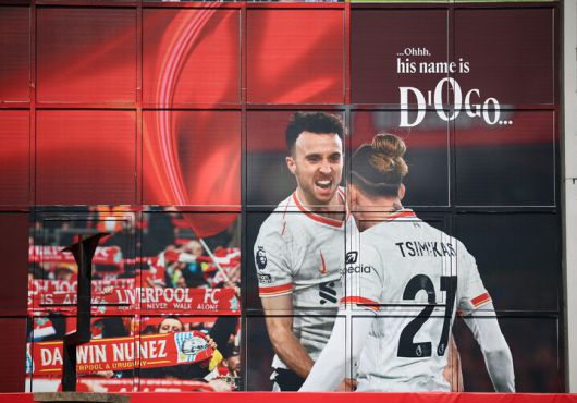 축구 팬들이 지난 3일(현지시각) 영국 프로축구팀 리버풀의 안방인 안필드에서 디오구 조타를 추모하는 모습. 리버풀/AP 연합뉴스 |