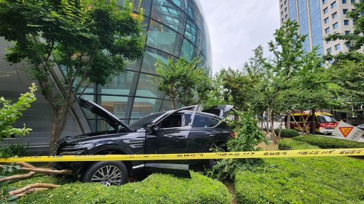 SUV는 회관 건물과 부딪히진 않았으며, 주변 조경수를 들이받고 멈춰 섰습니다.