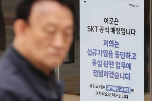 서버 해킹으로 인한 유심(USIM) 정보 유출 사태가 발생한 에스케이(SK)텔레콤이 신규 가입 업무 중단을 시작한 지난 5월 5일 서울 시내의 한 에스케이텔레콤 직영점에 관련 안내문이 붙어있다. 연합뉴스 |