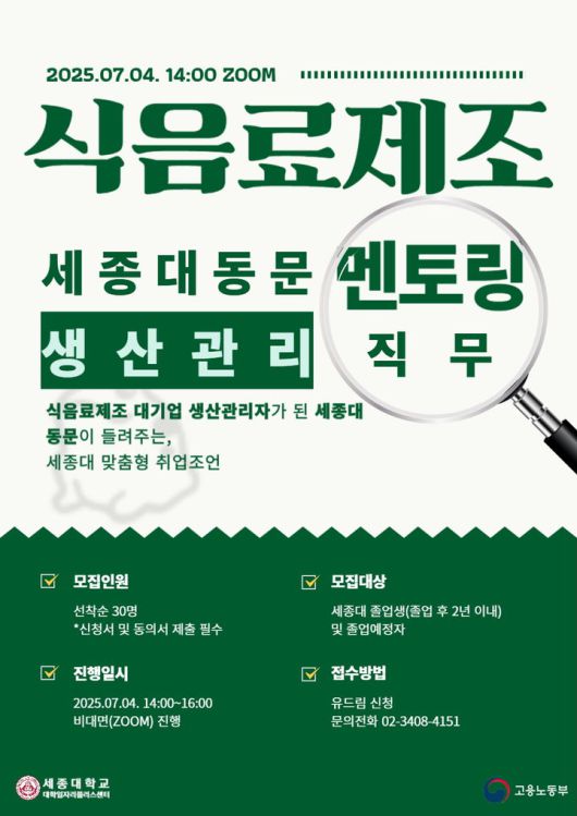 [서울=뉴시스]전수현 인턴 기자 = 세종대 대학일자리플러스센터는 7월 4일 오후 2시 식음료 제조 대기업에 재직 중인 실무자를 초청해 '동문 멘토링 특강'을 온라인(ZOOM)으로 진행한다.