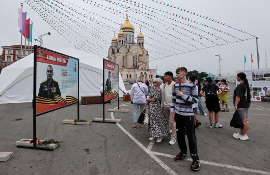 러시아 우크라이나 전쟁 중 쿠르스크 지역에서 사망한 것으로 알려진 러시아 해군 부사령관 미하일 구드코프 소장의 사진이 걸린 게시판 앞에 헌화된 꽃들이 놓여 있다. /로이터 연합뉴스 |