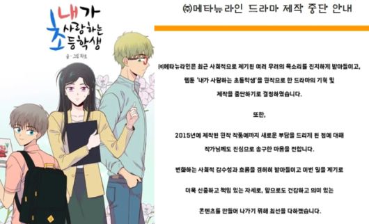 4일 웹툰 내가 사랑하는 초등학생 IP 기반 드라마를 기획·제작하는 제작사 '메타뉴라인'은 공지문을 통해 "최근 사회적으로 제기된 우려의 목소리를 진지하게 받아들인다"며 "웹툰 내가 사랑하는 초등학생을 원작으로 한 드라마 기획 및 제작을 중단하기로 결정했다"고 밝혔다.