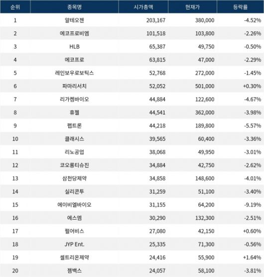 4일 한국거래소에 따르면, 시가총액 1위 알테오젠(액면가 500원)은 현재가 380,000원으로 전 거래일 대비 4.52% 하락하며 하락세를 보이고 있다. 상장주식수 53,465주에 외국인비율이 14.76%인 이 종목은 PER 162.60, ROE 29.52로, 재무 지표에서 고평가된 모습을 보인다. 바이오 대장주인 에코프로비엠(247540)(액면가 500원)은 103,800원으로 2.26% 하락하며, 거래량 232,084주를 기록하고 있다.