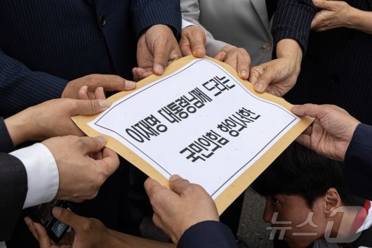 유상범 국민의힘 원내운영수석부대표와 김은혜 원내정책수석부대표를 비롯한 의원들이 4일 서울 용산구 대통령실 앞에서 우상호 정무수석에게 항의서한을 전달하고 있다. 국민의힘은 이날 추가경정예산(추경)안에 대한 여야 합의가 최종 결렬된 책임이 더불어민주당의 대통령실 특수활동비(특활비) 증액 요구에 있다며, 대통령실을 찾아 대국민 사과를 요구하는 항의서한을 전달했다. 2025.7.4/뉴스1 ⓒ News1 이재명 기자 |