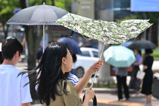 광주지역에 폭염특보가 이어지고 있는 가운데, 4일 오후 광주 북구청 사거리에서 한 시민이 양산을 펼치고 있다. 뉴시스 |