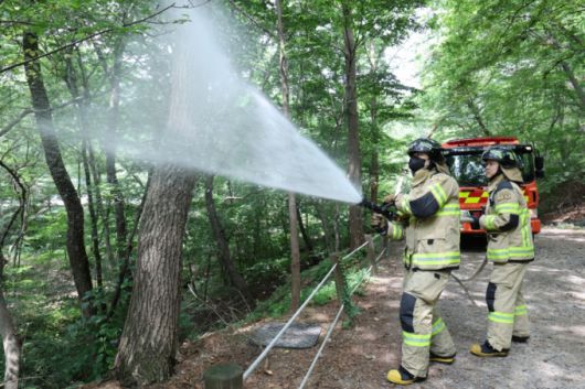 3일 서울 노원구 삼육대학교 인근 제명호에서 서울소방 관계자들이 '러브버그(붉은등우단털파리)' 방제 작업을 하고 있는 모습. /사진=뉴시스. |