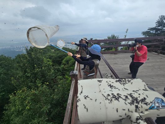 4일 오전 국립생물자원관 연구관들이 인천 계양산 정상에서 러브버그(붉은등우단털파리)를 포집하고 있다. /뉴스1 |