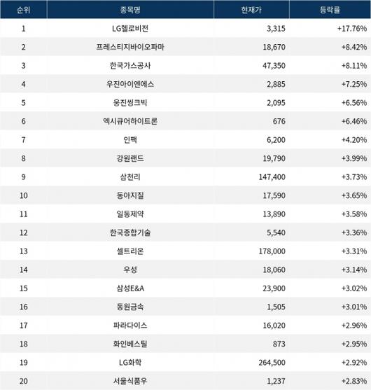 이어 상승률 2위 프레스티지바이오파마(950210)는 주가가 8.42% 상승하며 종가 18,670원에 마감했다. 상승률 3위 한국가스공사(036460)의 주가는 47,350원으로 8.11% 상승하며 양호한 성적을 보였다. 상승률 4위 우진아이엔에스(010400)는 7.25% 상승하며 2,885원에 마감했다. 상승률 5위 웅진씽크빅(095720)은 6.56%의 상승세를 타고 종가 2,095원에 마감했다.