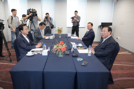 지난달 19일 세종에서 모임을 갖고 '해수부 부산 이전' 등 충청권 현안을 두고 의견을 나눈 충청권 시도지사들. 세종시 제공 |