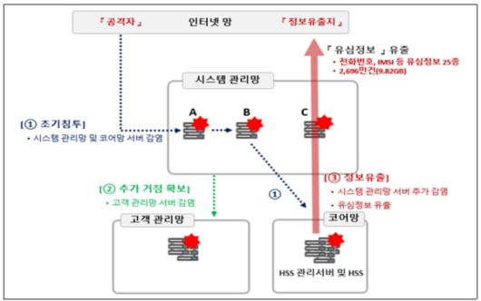 공격자는 '시스템 관리망' 서버를 통해 침입을 시작해 2021년 12월 '코어망'의 '음성통화인증(HSS) 관리 서버' 및 HSS 서버에 악성코드를 심었다. 2022년 6월에는 '고객 관리망' 서버에 추가 거점을 만들었다. 이를 바탕으로 지난 4월 유심정보 25종 가입자식별번호(IMSI) 기준 2696만건 9.82기가바이트(GB) 분량 정보를 빼냈다. 총 28대 서버에서 악성코드 33종을 발견했다.