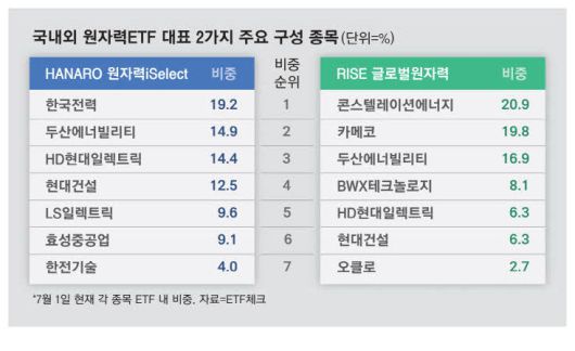 RISE 글로벌원자력(RISE)은 미국과 캐나다의 대표 원전주인 콘스텔레이션에너지(20.9%) 카메코(19.8%) 등이 주력이다. 두산에너빌리티를 16.9% 담고 있어 하나로 ETF보다 두산 비중이 높다. 고속 성장하는 두산에너빌리티와 해외 분산이 목적인 투자자에게 안성맞춤이란 평가다. ETF는 시총이 1000억원은 넘어야 투자자 입장에서 매수·매도가 편리하다. 두 ETF 모두 이 요건을 넉넉히 충족한다.