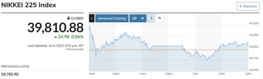 일본증시 닛케이225지수는 전장보다 24.98포인트(0.06%) 오른 3만9810.88에, 토픽스지수는 1.80포인트(0.06%) 밀린 2827.19에 장을 마감했다.