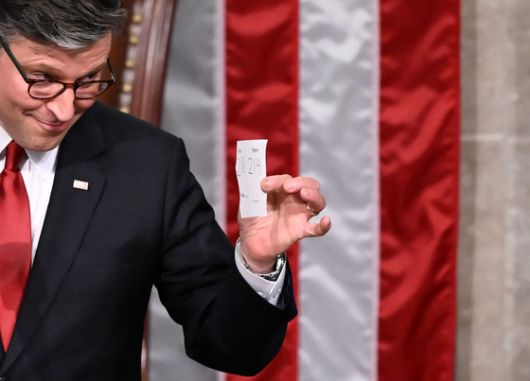 마이크 존슨 미국 하원의장이 3일(현지시간) 워싱턴 DC 하원 의사당에서 도널드 트럼프 대통령의 감세 법안에 대한 하원 투표 집계 결과를 보여주고 있다. AFP=연합뉴스 |