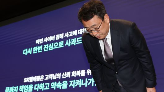 유영상 SK텔레콤 사장이 4일 오후 서울 중구 SKT타워에서 열린 해킹 사태 관련 입장 및 향후 계획 발표 기자회견에서 고개 숙여 사과하고 있다./박성원 기자 |