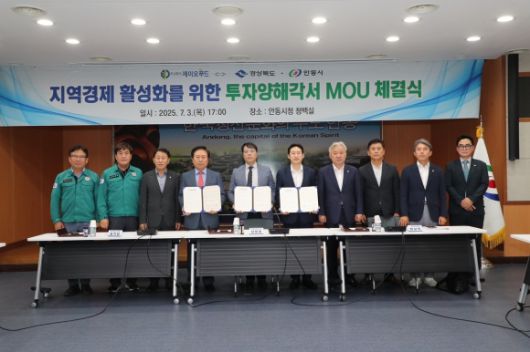 4일 경북도에 따르면 제이오푸드는 전날 안동시청에서 경북도, 안동시와 식육·식품 제조공장 신설을 위한 투자협약을 맺었다.
