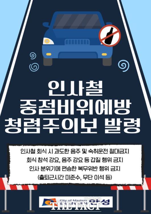 안성시는 △과도한 음주와 숙취 운전 절대 금지 △회식과 음주 강요 등 갑질 행위 금지 △인사 분위기 편승한 복무 위반 행위 금지 등을 조처했다.