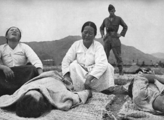 여순사건때 가족을 잃고 오열하는 민간인들을 진압작전을 지휘한 미국 임시군사고문단원이 지켜보고 있다. 여수지역사회연구소 제공 |