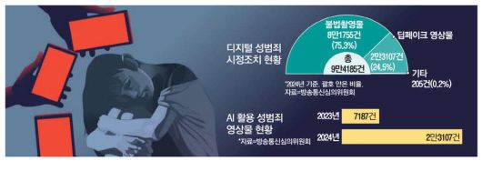 방송통신심의위원회는 최근 발간한 '2025년 제1호 방송통신 심의동향' 보고서를 통해 지난 한 해 동안 인터넷 불법 및 유해 정보 34만6686건에 대해 '시정요구' 조치를 내렸다고 밝혔다. 특히 이 가운데 디지털 성범죄에 대해 내린 시정요구 조치는 9만4185건으로, 전체의 27.2%를 차지하며 가장 큰 비중을 기록했다. 이는 전체 불법·유해 정보 중에서 디지털 성범죄가 차지하는 비중이 갈수록 커지고 있음을 보여주는 수치로, 사회적 경각심을 더욱 높이고 있다.