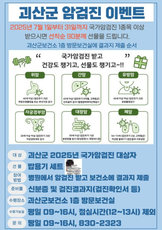 충북 괴산군보건소는 오는 31일까지 '국가암검진 이벤트'를 진행한다고 4일 밝혔다.