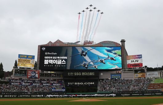 행사 시작에 앞서 공군 군악대가 애국가를 연주하며, 더불어 공군 특수비행팀 블랙이글스가 첨단 국산 초음속 항공기 T-50B로 화려한 곡예비행 에어쇼를 펼친다. 1966년 창설된 블랙이글스는 정밀하면서도 스릴 넘치는 비행 실력을 앞세워 국내외 주요 에어쇼에서 활약해왔으며, 이번에도 야구장 상공에서 특별한 볼거리를 선사할 전망이다.