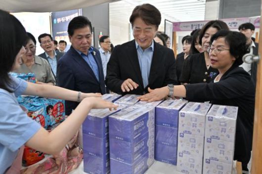 김이강 광주 서구청장이 4일 서구청 1층에서 열린 'MBTI 기부챌린지 바자회'에서 직원기부물품 부스와 천원국시, 김밥 등 먹거리 부스를 살펴보고 있다. 광주 서구 제공 |