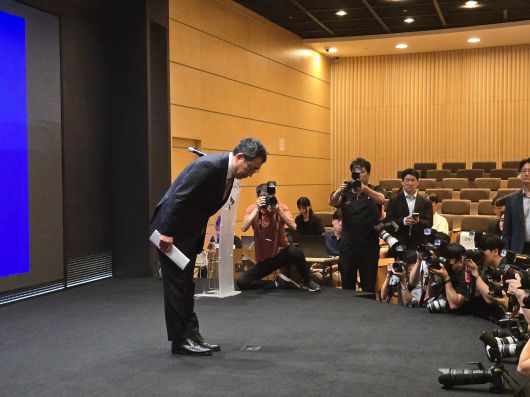 유영상 SK텔레콤 사장이 정부의 해킹 사태 관련 최종 조사 결과가 발표된 4일 서울 중구 SKT타워에서 열린 해킹 사태 관련 입장 및 향후 계획 발표 기자회견에서 고개 숙여 사과하고 있다./정두용 기자 |