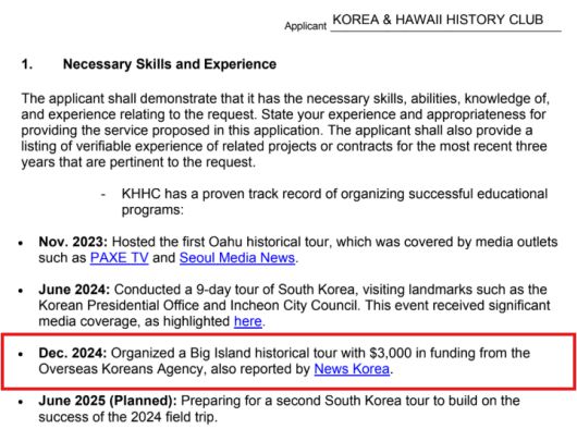 KHHC가 작성한 다른 문건에서도 재외동포청 후원을 짐작할 수 있는 내용이 나왔다. KHHC는 하와이 주정부에 지원금을 요청하는 문건에서 하와이 내 견학 프로그램에도 재외동포청으로부터 3,000달러를 받았다고 밝혔다.