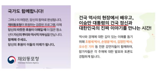 KHHC가 작성한 행사 모집 공고문에 “올해도 재외동포청의 후원을 받는다”며 “한국 체류비 전액 무료”라는 내용이 명시돼 있는 한편, 재외동포청도 재정적 지원 사실을 인정했다.