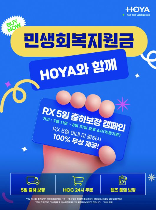 호야는 먼저 지난 2020년 정부의 재난지원금 지급 당시 안경원에 급격히 수요가 몰리자 납기 지연 문제가 발생했던 경험을 반영해 RX 5일 출하 보장 캠페인을 운영한다. 렌즈 주문일을 제외한 영업일 기준 5일 이내 출하를 약속하며, 출하 지연 시 해당 제품은 100% 무상 처리된다. (단, 공휴일·일요일 및 착색 렌즈 제외)