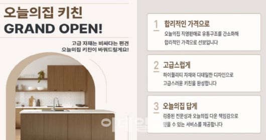 [이데일리 한전진 기자] 라이프스타일 플랫폼 오늘의집이 부엌 시공 패키지 상품 ‘오늘의집 키친’을 출시하며 인테리어 시공 시장에 본격적으로 진출한다. 기존 가구·생활용품 중심 커머스에서 공간 설계와 시공까지 직접 책임지는 구조로 사업 외연을 넓히고 있다.